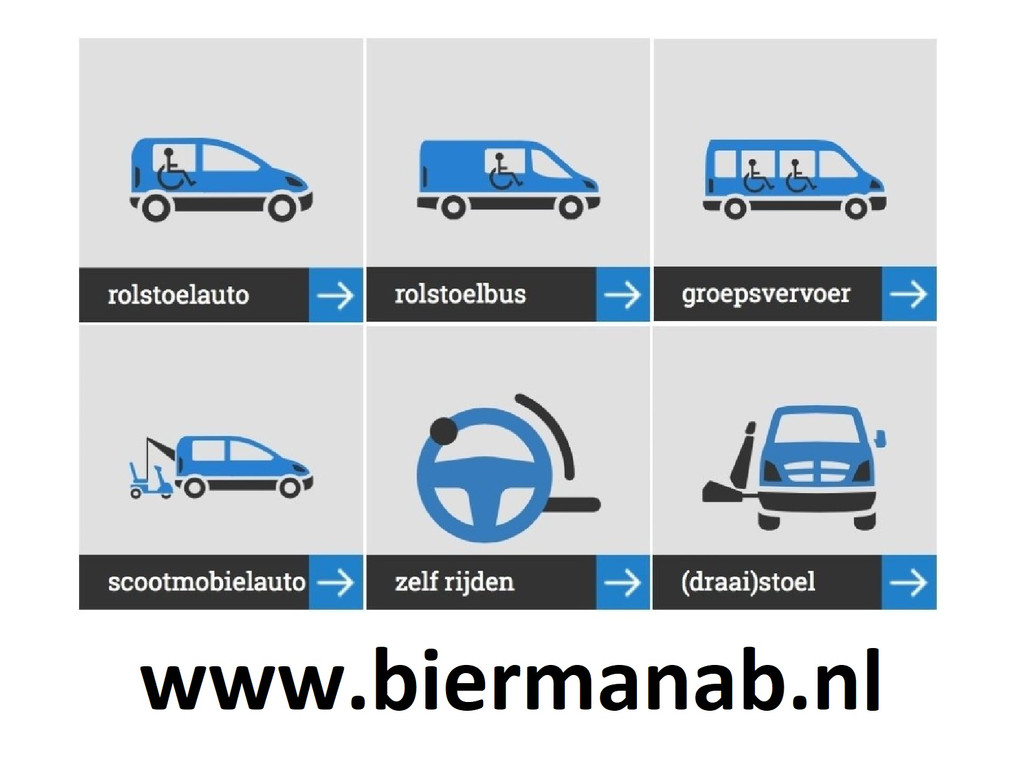 *) Bierman Afleverpakket Rolstoelbus (€ 1.500,- incl. BTW) bevat alle onderdelen van het Rolstoelauto-pakket, aangevuld met een LPK (liftkeuring) en begeleiding bij aanvragen voor verlaagde wegenbelasting, ontheffing tussenschot, en eventuele vrijstelling BPM.