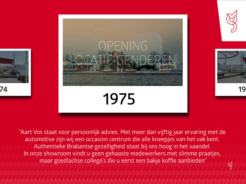 Fabrikant: Automobielbedrijf Aart Vos B.V. Genderensedijk 11 4265JJ GENDEREN, NL 0416351105 http://www.aartvos.nl verkoopgenderen@vosgewoongoed.nlWelkom bij Aart Vos "+50 jaar ervaring!" Wij bieden een totaalpakket op het gebied van autorijden. Dit totaalpakket omvat o.a.: verkoop van nieuwe en gebruikte auto's, reparaties en onderhoud, leasing, financiering en verzekering, snelservice en accessoires. Dit alles geschiedt in een zeer sfeervolle en hartelijke ambiance met vakkundige medewerkers. Onze verkoopprijzen betreffen meeneemprijzen. Uitbreiding met onze servicepakketten is mogelijk. Vraag onze adviseurs naar de mogelijkheden. We hanteren geen reserveringen, ook niet voor proefritten of bezichtigingen, zodat iedereen gelijke kansen heeft. Alle moeite is genomen om de informatie op deze internetsite zo accuraat en actueel mogelijk weer te geven. Fouten zijn echter nooit uit te sluiten. Vertrouw daarom niet alleen op deze informatie, maar controleer bij aankoop de zaken die uw beslissing zouden kunnen beïnvloeden.