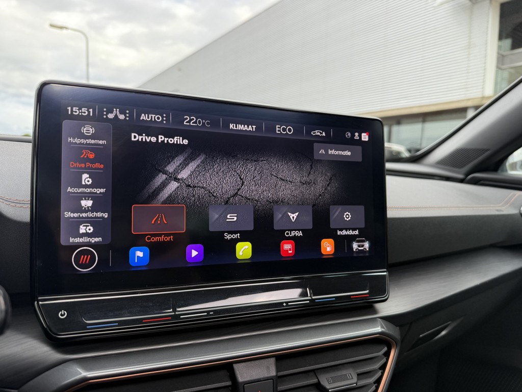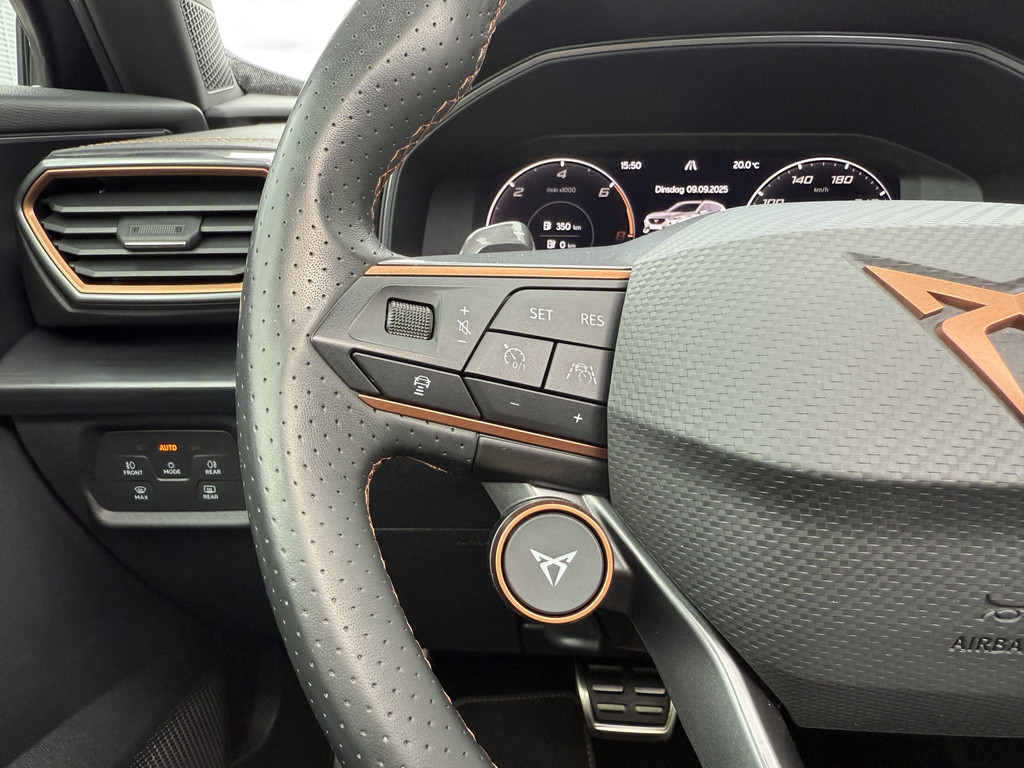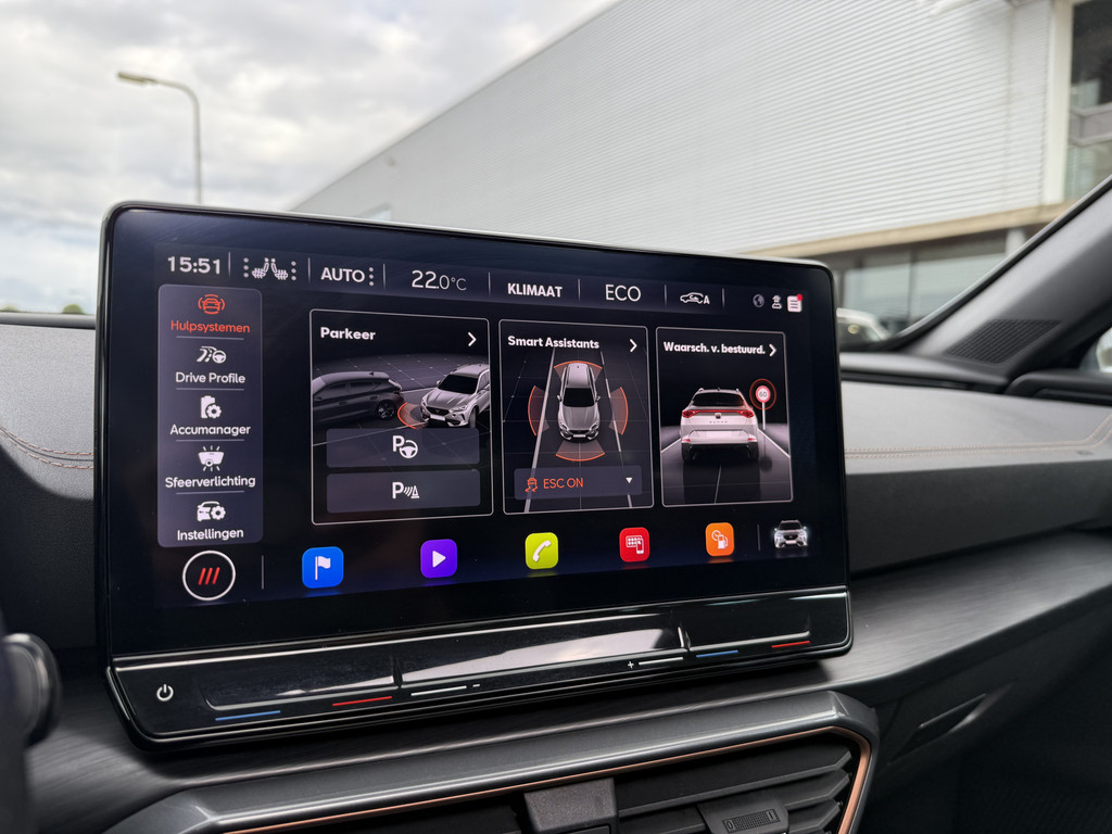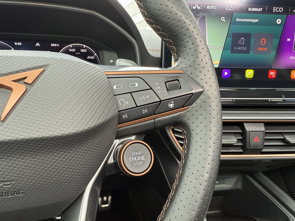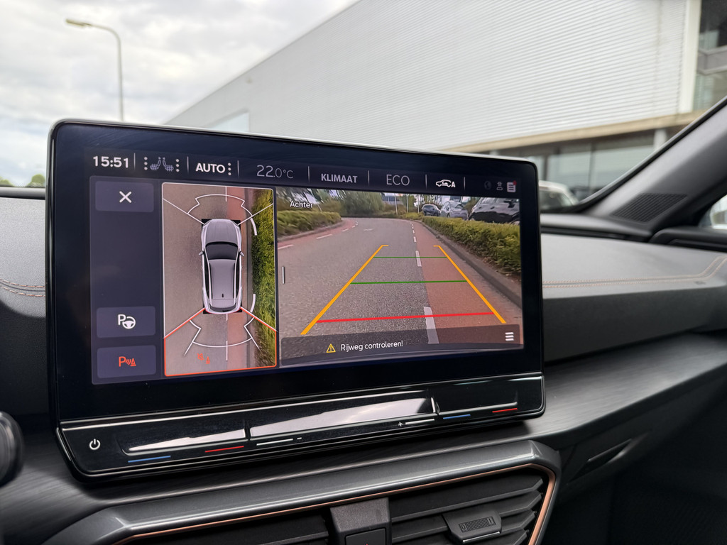 In deze auto zijn verschillende technologieën aanwezig die voor jou het verkeer en de omgeving in de gaten houden en die desnoods ook kunnen remmen of bijsturen. Bij de veiligheidssystemen van deze CUPRA hoort ook de verkeersbord-detectie. Die leest tijdens het rijden als het ware met je mee en attendeert je op de significante verkeersborden langs en boven de weg. Het Lane-keeping systeem garandeert dat je je niet onverhoeds buiten de lijnen van de rijstrook begeeft. Botsingen met een voorligger gebeuren relatief vaak. De forward collision warning slaat tijdig alarm als dat risico ontstaat, zodat je kunt ingrijpen. Dankzij veiligheidsvoorzieningen als dodehoekdetectie, hill hold functie, vermoeidheidsherkenning, autonoom remsysteem en bandenspanningcontrolesysteem, ben je steeds veilig onderweg.