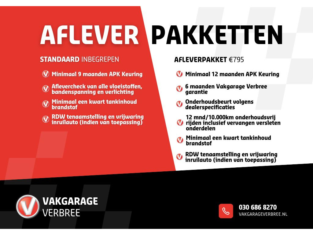- Afleverpakket 6 maanden (€ 795): - 6 maanden Vakgarage Verbree garantie - Minimaal 12 maanden APK keuring - Onderhoudsbeurt volgens dealerspecificaties - 12 mnd/10.000km onderhoudsvrij rijden inclusief vervangen versleten onderdelen - Airco servicebeurt - 12 maanden Vakgarage pechhulp